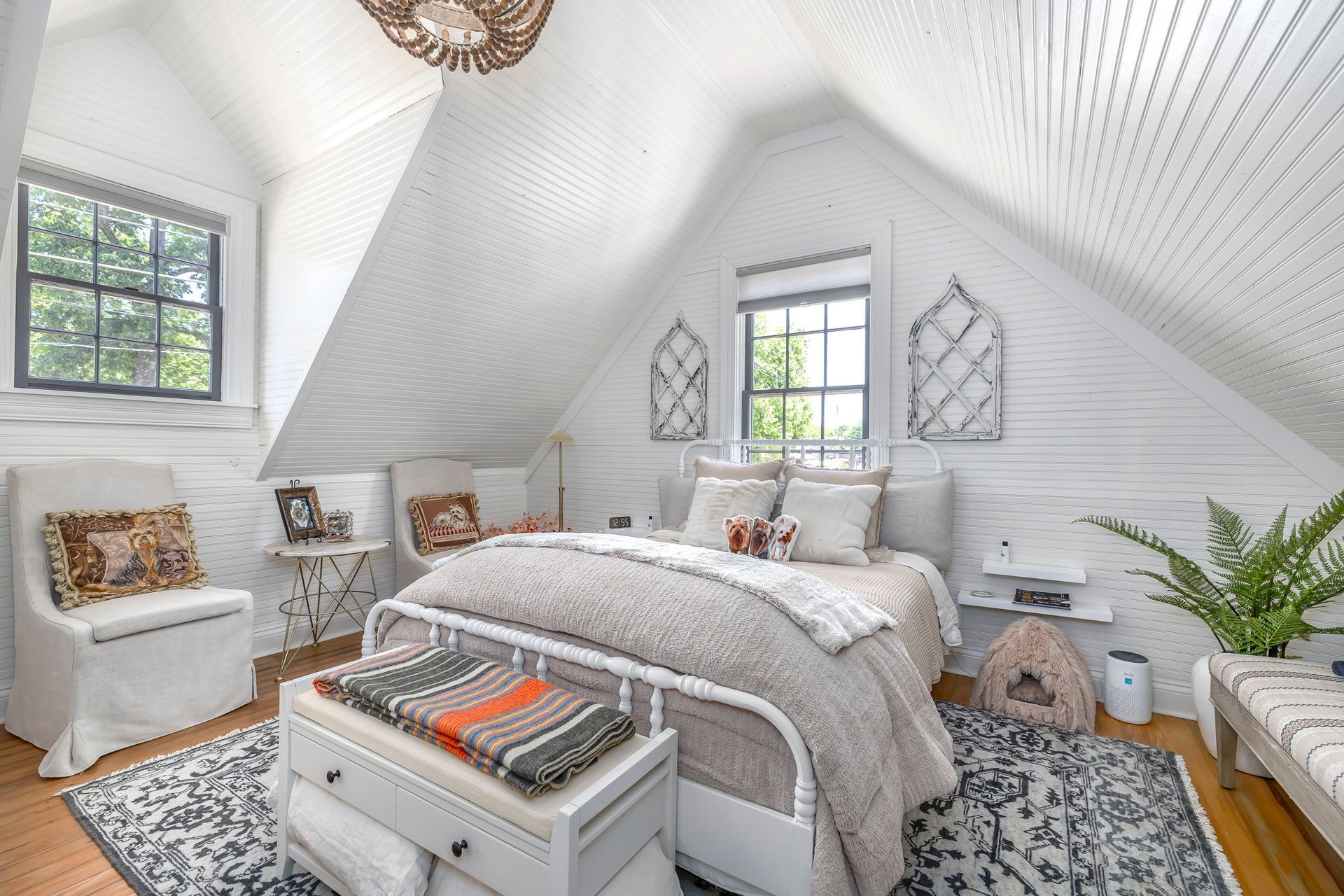 Sterns and Foster King Bed, Fine Linen sheets, TV, alarm clock, air purifier, coat closet, vanity